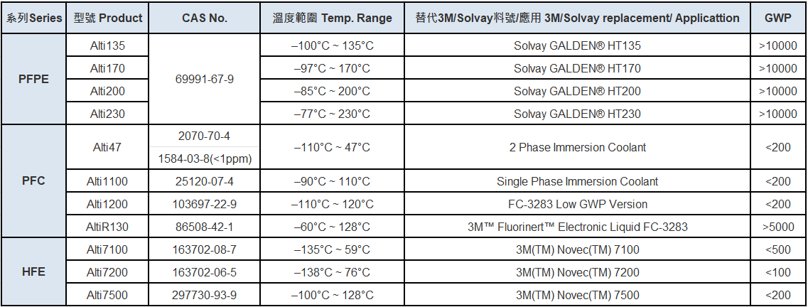 The product lineup includes PFPE (Perfluoropolyether), PFC (Perfluorocarbon), and HFE (Hydrofluoroether) fluids, all offering outstanding thermal stability, dielectric strength, and material compatibility.